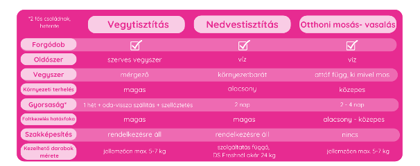 - Vegytisztítás: Ideális a finom, érzékeny anyagok esetében, de jelentős egészségi, környezeti, költségbeli teher és lelkiismereti kompromisszumokkal is járhat.