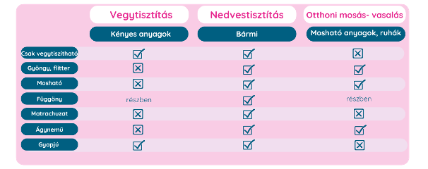 - Nedvestiszítás: A legmodernebb környezetbarát technológia, amely kíméletes, gyors és hatékony, ugyanúgy alkalmas minden olyan tételre, amit vegytisztítóba vinnél. A probléma az az, hogy a gyártók is kevésbé ismerik, így a ruhacímkékben kevésbé lehet bízni.
