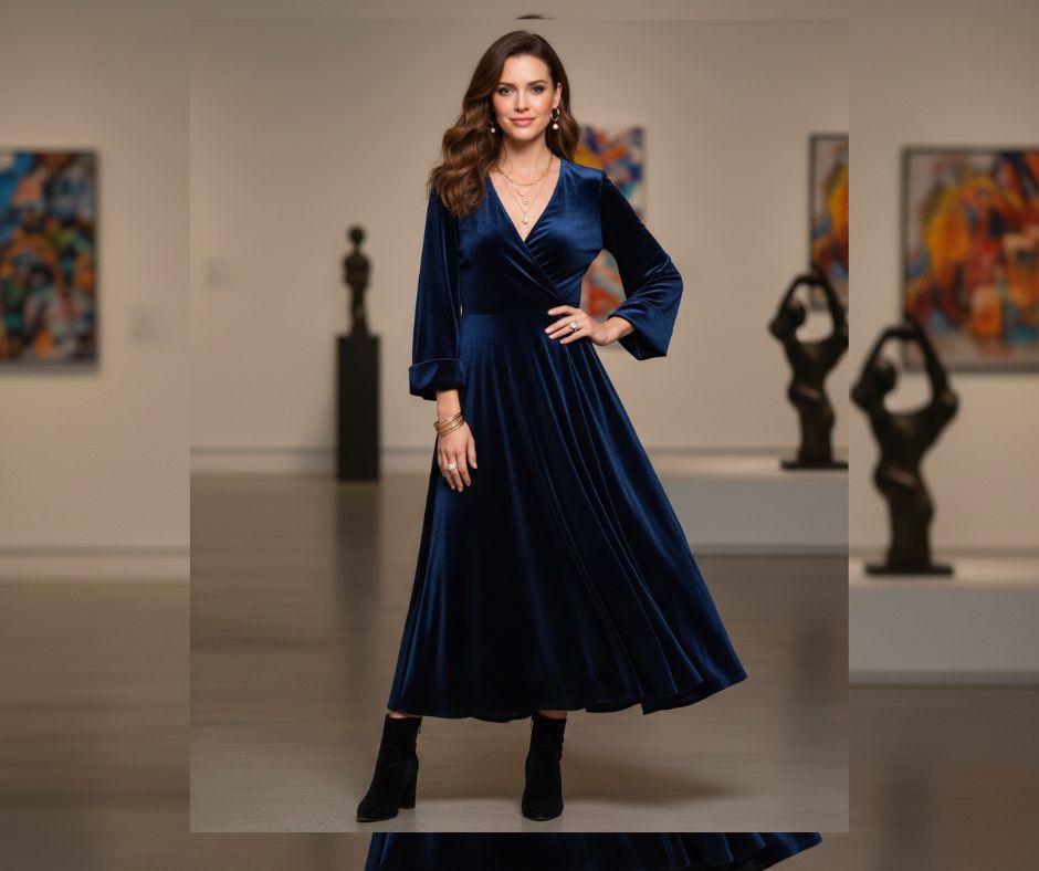 - Velvet wrap dress (burgundy, deep green, or navy) – elegant, comfortable, and stunning in photos